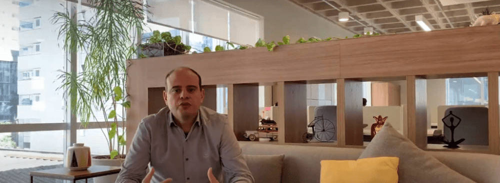 Marcelo Braga dando entrevista no lounge do escritório Reachr